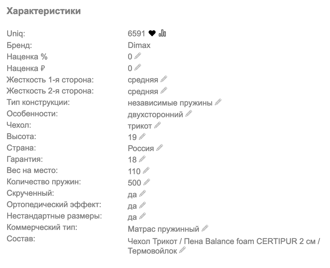 Система позволяет добавлять новые карточки товаров того или иного бренда, делать их активными или нет, устанавливать наценку или уценку, а так же редактировать информацию внутри карточки - Отображение незаполненных параметров